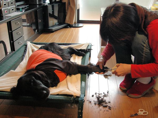 早速準備をし、爪切りと毛のカットを、足1本ずつやっていきます。