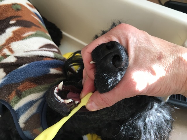 たいていの犬では皆そうなのですが、口を開けて手を突っ込むと顎をあぐあぐ動かし指をかまれそうになるので、外側の歯しか磨けない(歯石取りできない)場合がほとんど。