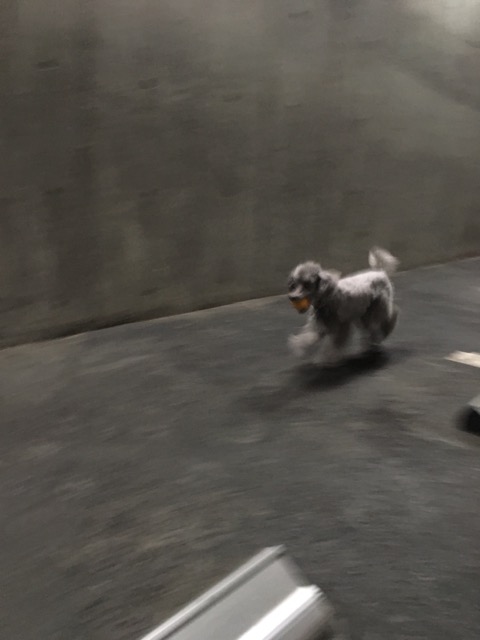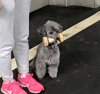 この試験の中には150g以上の重さの木製ダンベルの持来や60センチの高さの障害飛越が含まれており、トイプードルにとっては非常にハードルの高い試験なのですが、このワンコ、14歳にしてそれもなんのその!60センチの障害はちょっと引っかかるので、通常は50~55でトレーニングしていますが、顔に似合わない大きなダンベルは喜んでくわえて走ってきます。