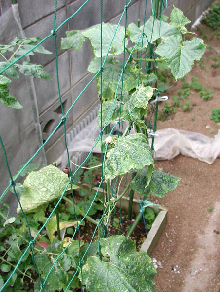 葉の色も、他の葉に比べて黄色っぽいまだら模様があり、キュウリらしさがいまいち。