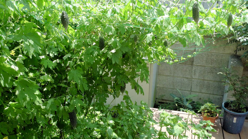 ちなみにミニトマトは、ゴーヤの弦に飲み込まれてすっかり姿が見えなくなっています。