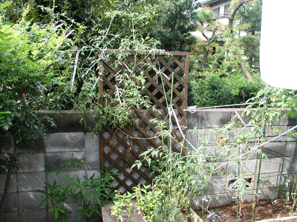 トマトの根っこは一番右下、一番上はラティスの上3カ所にはみ出ています