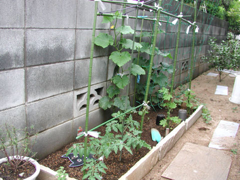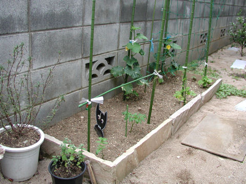 10日頃、手前の空きスペースに2本の中玉トマトの苗を植え、