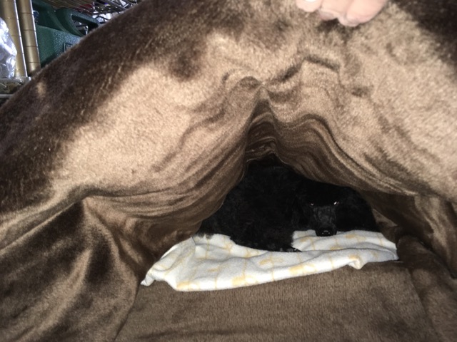 その後もう3年以上もしまい込んでいたのですが・・・・久しぶりに引っ張り出し、シャンプーしたてのキャビィを入れてみました。ビビリキャビィのことだから嫌がるかと思いきや・・・・入ったきり最奥に入り込み出てこない!