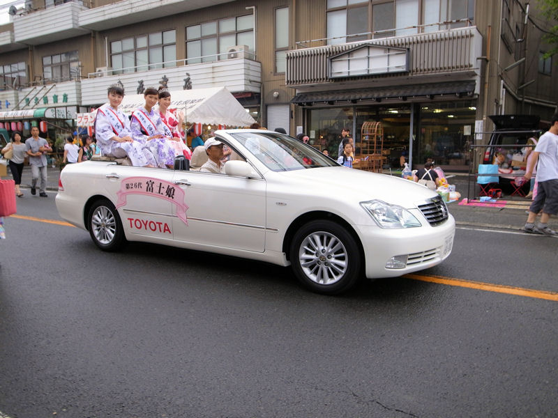 毎年選ばれる富士娘を先頭に、踊りや消防署の音楽隊などが通っていきます。